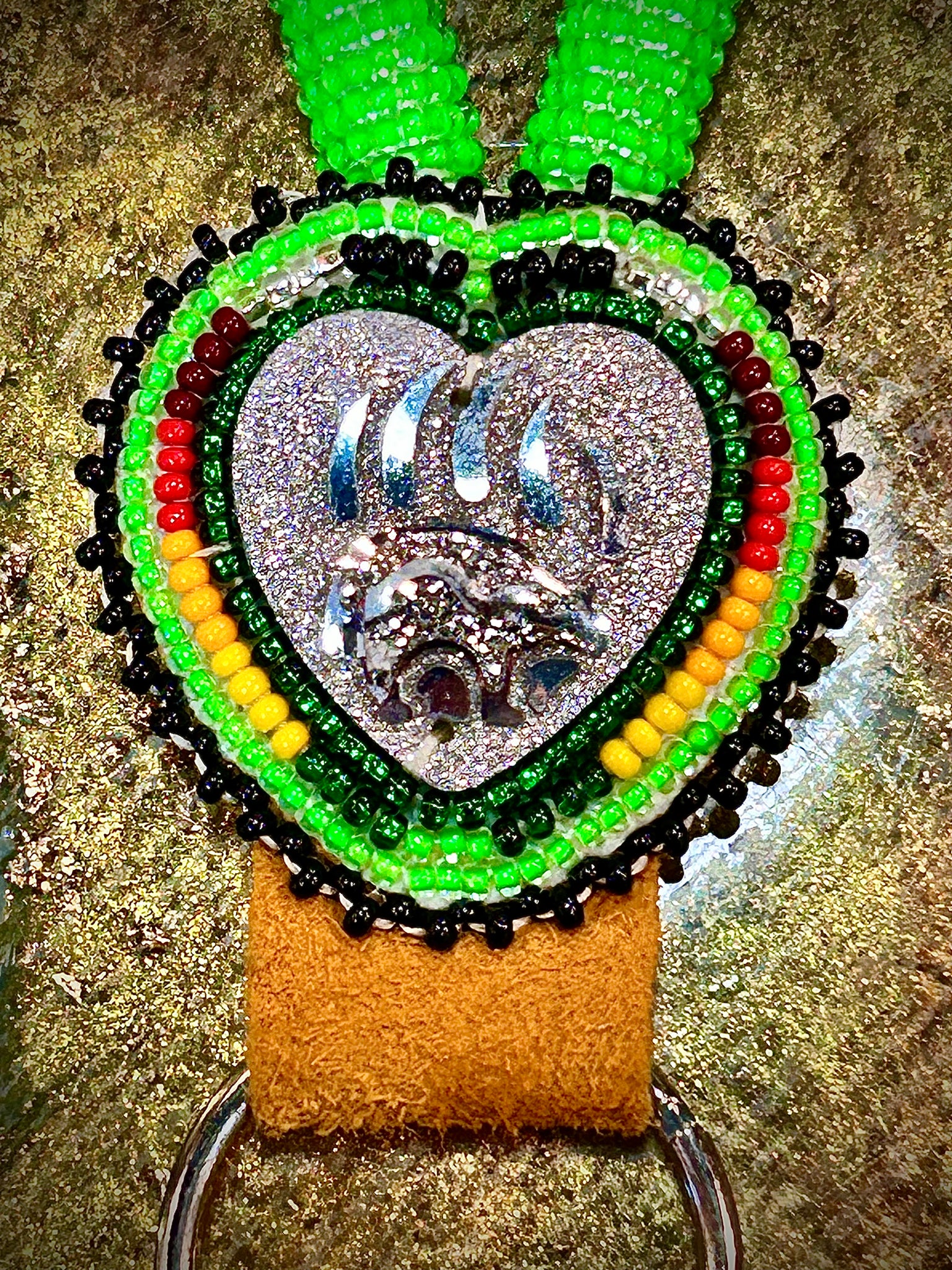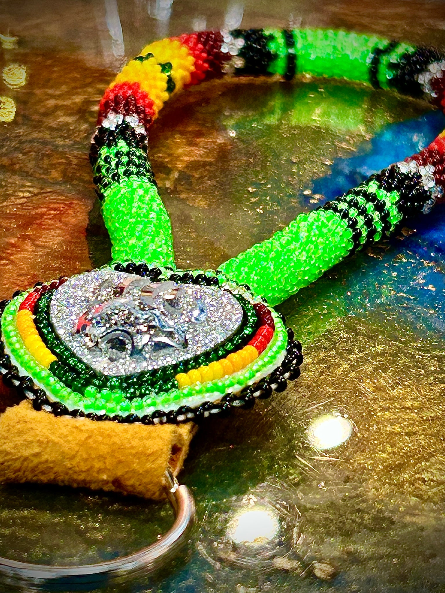Green, black, yellow, orange and red lanyard Keychain. Made local in Fort Peck Assiniboin and Sioux Tribes of Montana by Sioux Valley Canadian artist Francis Hapa.